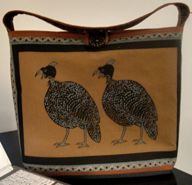 This bag was designed to hold a large laptop. The fabric is from Africa.