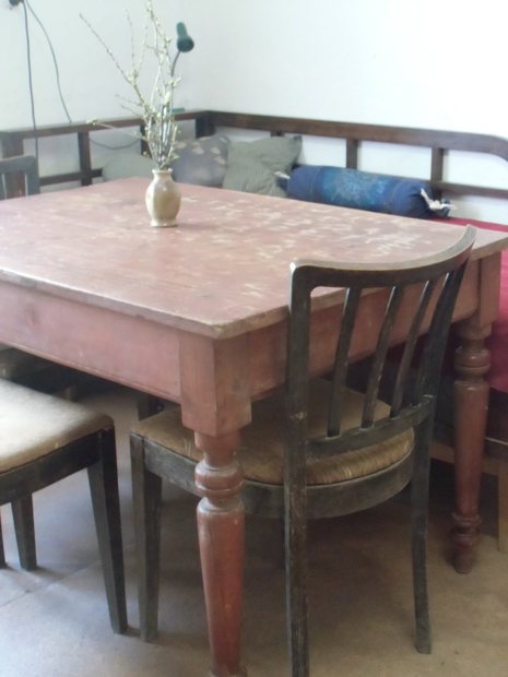o tomhle stolu byla řeč v blogu Střípky z deníčku natěračky...zachráněný z altánu, v Cotkytli byl pod počítačem, nyní opět kuchyňský...