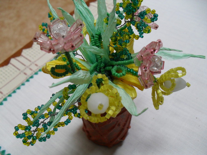 Kytička z drobných korálků navlečených na drátku,listy jsou z twist artu(barvený papírový provázek).Vázička je z lékové lahvičky upravené terakotovou barvou.