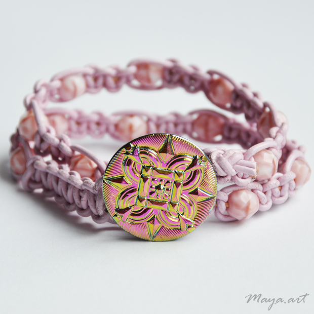 Náramek vytvořený z kožených šnůr a skleněných korálků technikou drhání. Náramek je doplněn o stylový knoflík. Moderní pojetí staré textilní techniky drhání, macramé :)