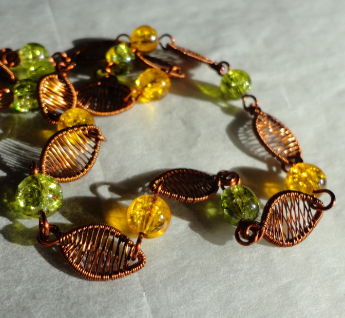 Náhrdelník je celý vyrobený ručně. Drátkované komponenty mají připomínat lístečky. Korálky, které jsem použila, jsou skleněné a popraskané.