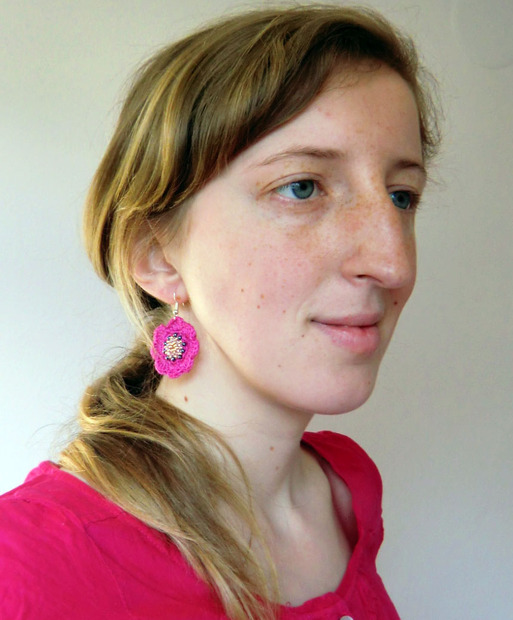 V mém obchůdku se můžete setkat s háčkovanými náušnicemi, které jsou dozdobené korálky. U výrobků nemám fotografii, jak vypadají náušnice na uších, a tak Vám jí přídávám zde :)