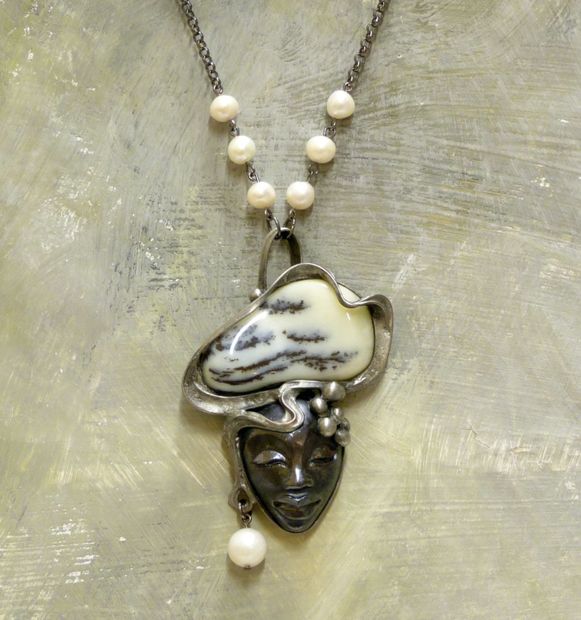 Keramický kabošon a dendritický opál v kombinaci s říčními perlami.