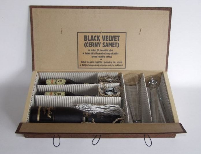 kazeta z lepenky, potahovaná ručně batikovaným sulfátovým papírem, kokosovými knoflíky a s obsahem pro přípravu koktejlu