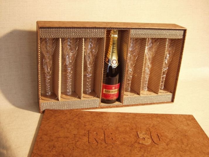 kazeta (na 6 sklenic od Bořka Šípka a láhev šampaňského) z lepenky, potahovaná ručně batikovaným sulfátovým papírem, s plastickým monogramem příjemce; uzávěr na pruženku a želvovinové knoflíky, vyrobené z 80 let starých polotovarů