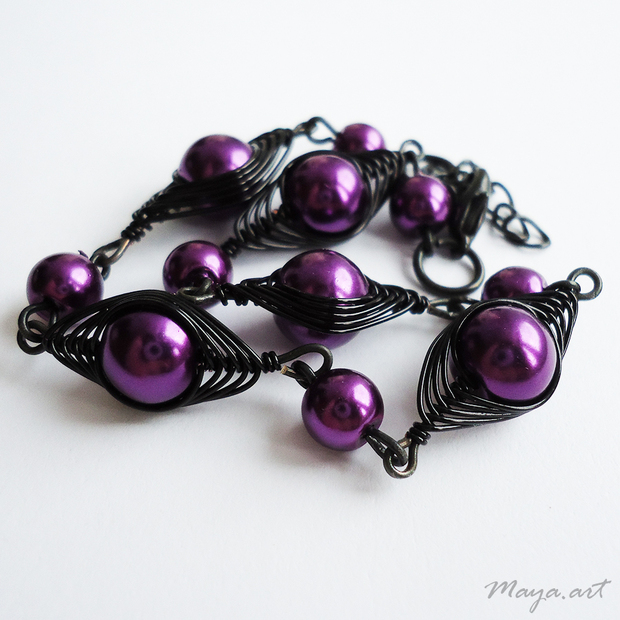 Jemný drátovaný náramek je vytvořen z černého drátku a fialových voskovek.