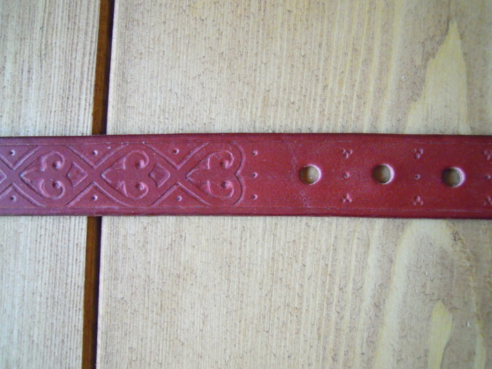 Opasek na zakázku bez spony a kování laděný k toulcům na luk a šípy. Zdobení za mokra tlačením parohovým hrotem.