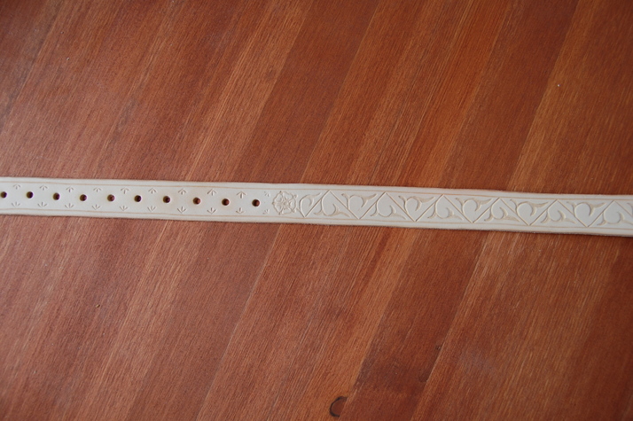 Opasek na zakázku bez spony a kování. Zdobení za mokra tlačením parohovým hrotem.