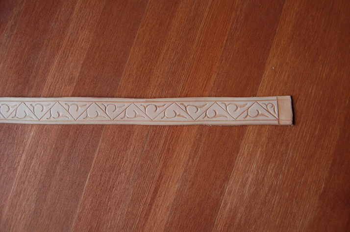 Opasek na zakázku bez spony a kování. Zdobení za mokra tlačením parohovým hrotem. Laděný k toulci na šipky do kuše.