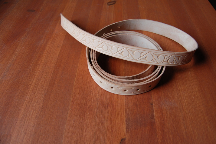 Opasek na zakázku bez spony a kování. Zdobení za mokra tlačením parohovým hrotem. Laděný k toulci na šipky do kuše.