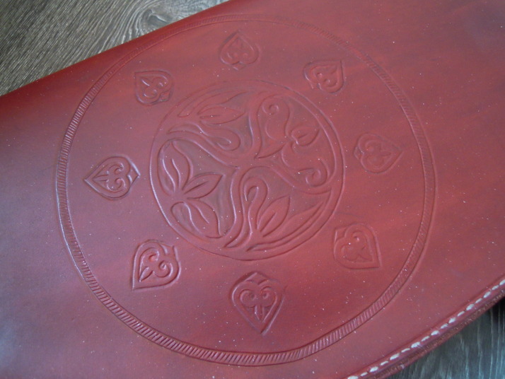 Podle maďarského vzoru vyrobené toulce na kompotiní zvratný jezdecký luk a šípy. Tmavě červeně mořená hovězina. Zdobění opět tlačením za mokra parohovým hrotem.