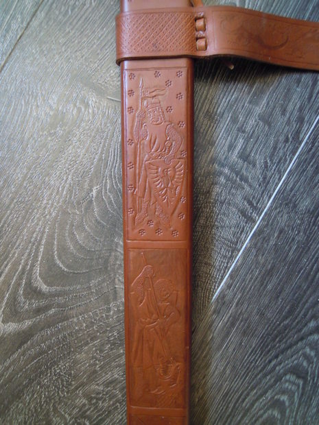 Na míru dělaná pochva má korpus dřevěný, ručně dlabaný a následně zaklížený. Potažená je 1mm silnou hovězinou. Zdobení opět za mokra tlačením parohovým hrotem. Doplněná je stejnou technikou zdobeným pásem s jednoduchým dobovým zavazováním.