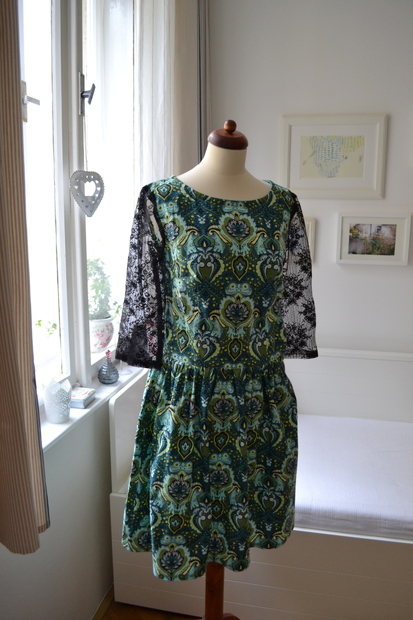 *Duben 2013* "Žabí" šaty z krásné pohádkové látky od návrhářky Tuly Pink. Rukávy z krajky.