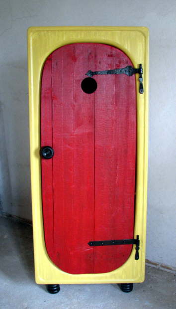 Veselá skříň vyrobená ze staré smaltované vany a starých dveří s původním kováním.