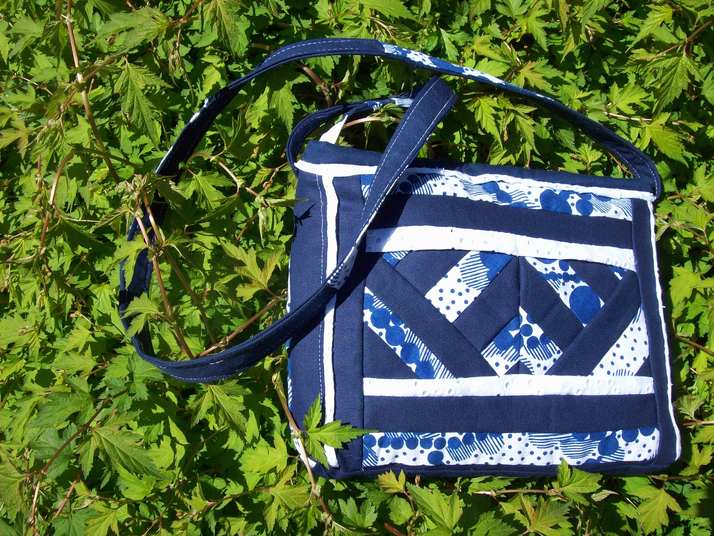 Menší taška z pevného tmavě modrého plátna, bílomodré bavlny a bílé madeiry, uvnitř s kapsou na zip, pěkně vyztužená a lehoučká.