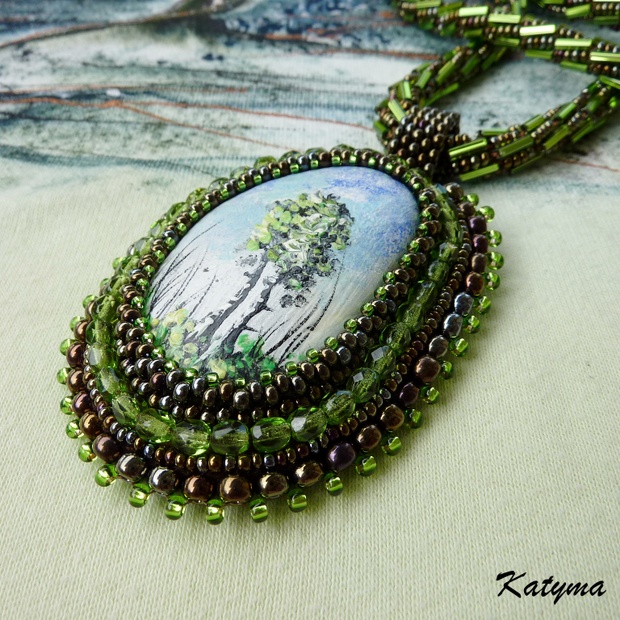 Kamínek je zavěšen na háčkované spirále vytvořené ze světle zeleného sekaného rokajlu a kulatého rokajlu v barvě hnědý iris.
