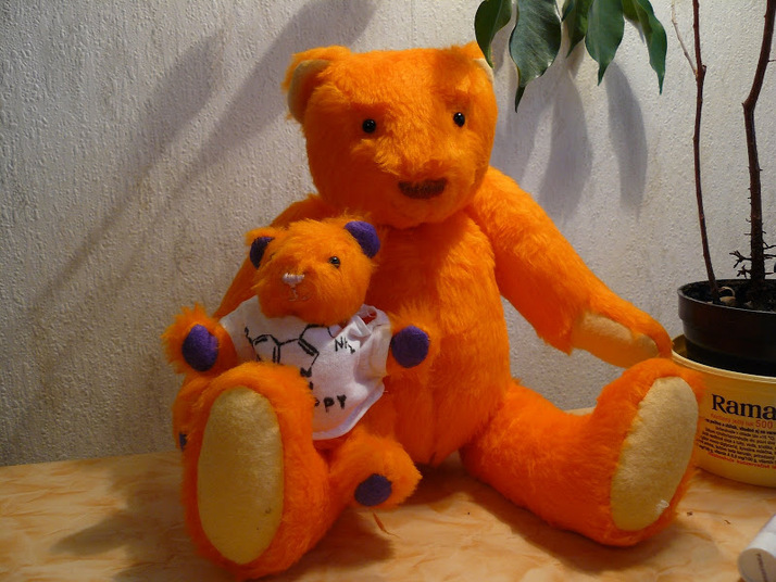 Má cca 50 cm, kinklací hlavu a spoustu nedokonalostí - můj druhý medvídek v pořadí :D Ten malý na jeho noze je Brumlík - můj první ušitý medvídek.