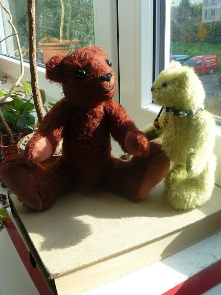 První mohéroví medvídci. Tlapička tmavě hnědý, Jack zelený. No... z mohéru se šije o dost jinak než z plyše...