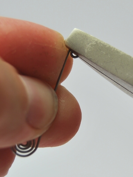 Z Osteofixu (0,6 mm) odštípněte drát dlouhý 7,5 cm. Na jednom konci vytvořte očko, uchopte ho plochými kleštěmi a tlakem proti ukazováku druhé ruky vytvořte spirálu do poloviny drátu. Postup opakujte na druhé straně a vytvořte dvojspirálu ve tvaru S.