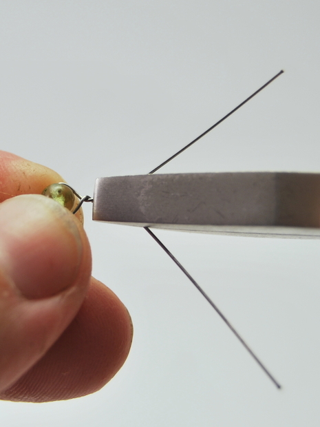 Olivínovou kuličku navlékněte na asi 5 cm dlouhý drát (0,4mm) a přesahující části drátu ohněte podél kuličky k sobě. Oba konce drátu pod kuličkou překřižte, pevně stiskněte kleštěmi a kuličkou dvakrát otočte. Opatrně, silný tah drátu by mohl křehký olivín rozdrtit. Jeden konec uštípněte.