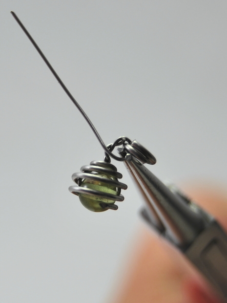 Olivín v klícce připevněte ke kroužku - drát nejprve oviňte okolo kroužku (obr. 9) a poté několikrát okolo něj samotného mezi kroužkem a klíckou. Přesahující konec odštípněte. Na jeden kroužek takto připevněte 5 olivínů, na druhý 7.