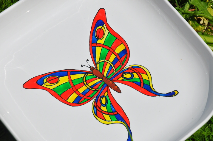 rozměr tácu 27x27cm. Předevčírem,když jsem jela na kole, mi jeden motýl frnknul kolem nosu a doma jsem si všimla, že mám na nose barvu z jeho křídel.....tak tady je:-)(velikost dva pytlíky chipsů,vysoký okraj cca 3 cm)