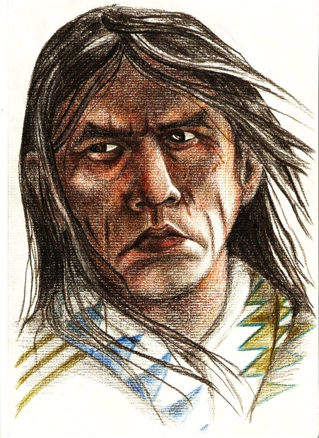 Formát A4, kresba pastelkou podle fotografie na strukturovaný papír typu Antik. Model Wes Studi, upravený por účely ilustrace k textu.