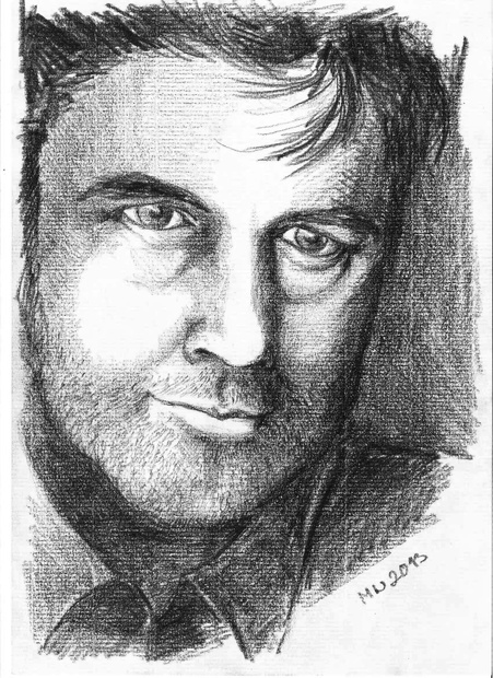 Formát A4, kresba tužkou na strukturovaný papír typu Antik. Kresba podle fotografie, model Brendan Coyle, pro účely ilustrace k textu.