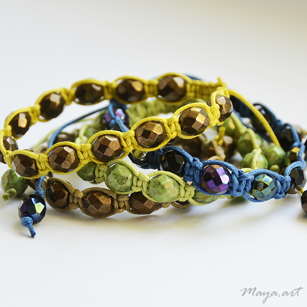 Náramky vytvořené z bavlněných šňůr a skleněných korálků technikou drhání. Moderní pojetí staré textilní techniky drhání, macramé :)