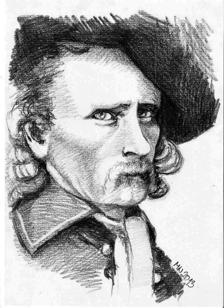 Formát A4, kresba tužkou na strukturovaný papír typu Antik. George Armstrong Custer. Kresba podle dobové fotografie pro účely ilustrace textu.