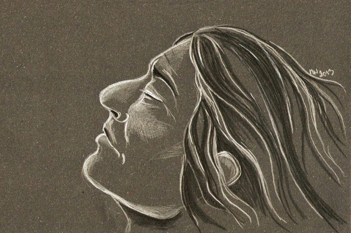 Kresba bílou a černou pastelkou na tmavý papír, formát A4.