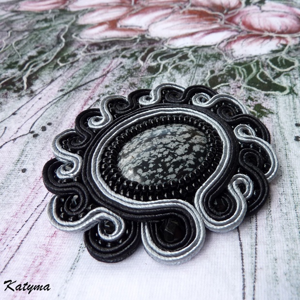 Brož vytvořená z krásného vločkového obsidiánu zdobeného sutaškami v černé a šedé barvě, rokajlem Preciosa a černými broušenými ohňovkami různých velikostí.