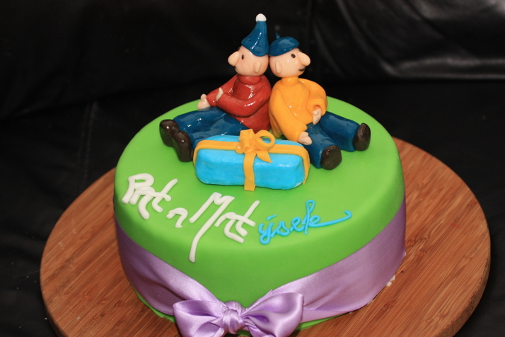 Pacholickova napln s malinami,vanilkovy korpus,potazeny fondanovym marcipanem,figurky