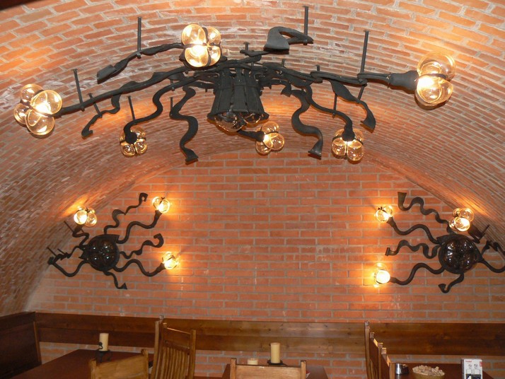 Originální kováná svítidla a lustr podle vlastního návrhu - kombinace prokované oceli a foukaného skla. Propojení funkčnosti a stylizace do plastického objektu.
