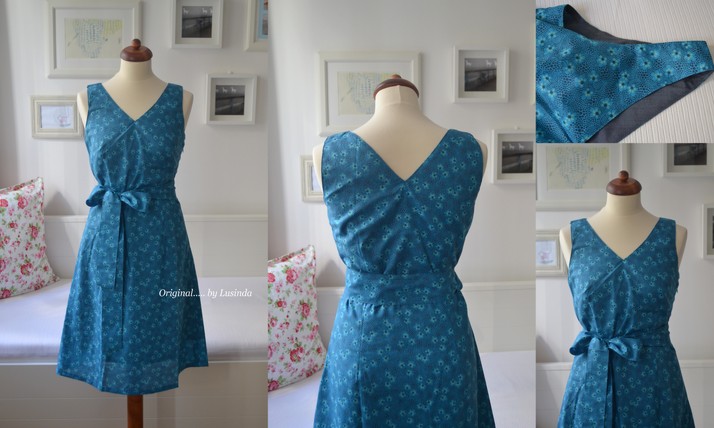 *Červenec 2013* Voál Amy Butler kolekce Cameo. Letní střih vzdušný, jemně do A. Výstřih do V zepředu i zezadu, zapínání na boku na skrytý zip. Celé podšity jemnou bavlnou, aby nebyly průhledné. Zavazování na dlouhou mašli ze stejné látky. Bez zkoušení.