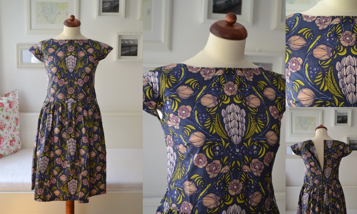 *Červenec 2013* šaty z překrásné látky z kolekce Luxe in Bloom od Sarah Watson. Zapínání vzadu na skrytý zip, vsazeny kapsy na bocích. Provedena jedna zkouška.