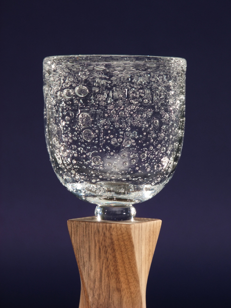 sklenice trpící ztrátou nohy u mne nalezne novou podobu a dostane druhou šanci na dlouhý život, ořechové dřevo, růženín, metál