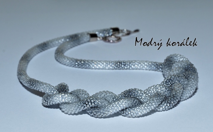 Háčkovaná dutinka, s délkou 90 cm je provedena z českého rokajlu v různých odstínech šedi.