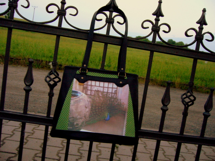 ukázka tištěného bavlněného panelu s motivem na přání, velikost kabelky je mírně zmenšená oproti standardním rozměrům - foceno bohužel za mírného šera