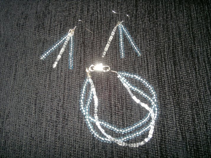 naušnice trojté modro bílé+náramek také modro bílí 70,- ruční práce