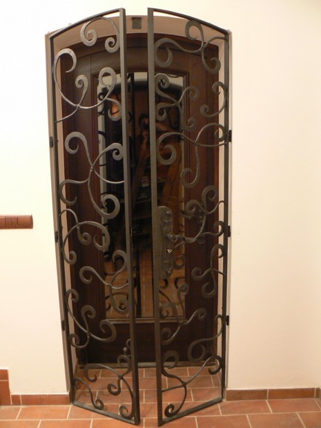 Dvoukřídlá mříž na zakázku, podle vlastního návrhu. Pověšena na kovaných pantech, součástí i klika ve tvaru lístku.