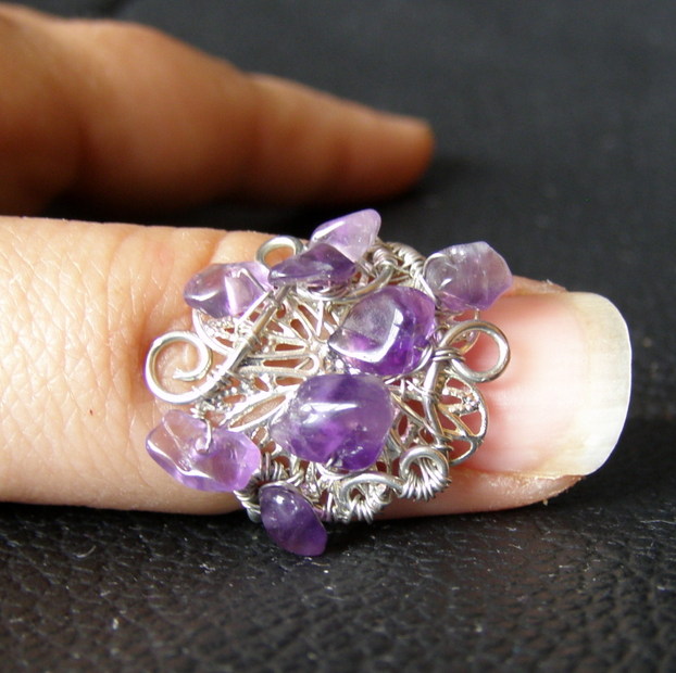 postříbřený drát, postříbřený filigrán, zlomky ametystu