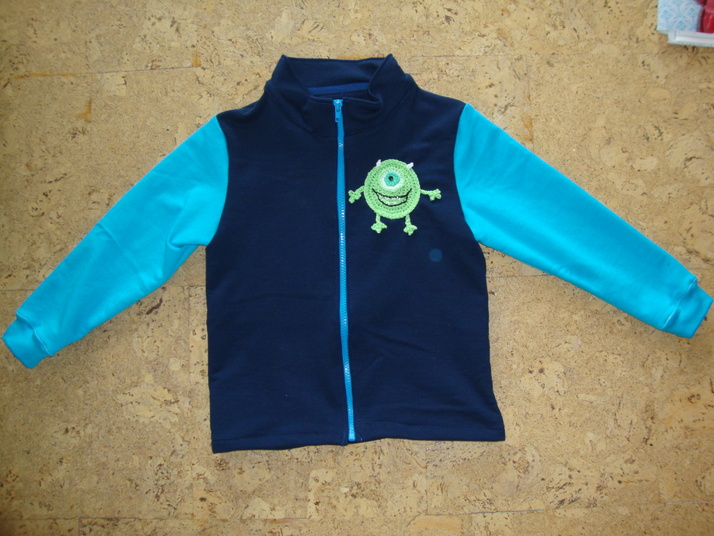 Mikina ušitá z teplákoviny s háčkovanou aplikací příšerky.