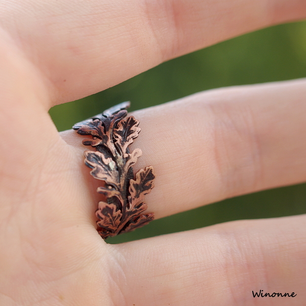 Prsten dělaný tradičními zlatnickými technikami. Měděná obroučka je ozdobena drobnými dubovými lístky.