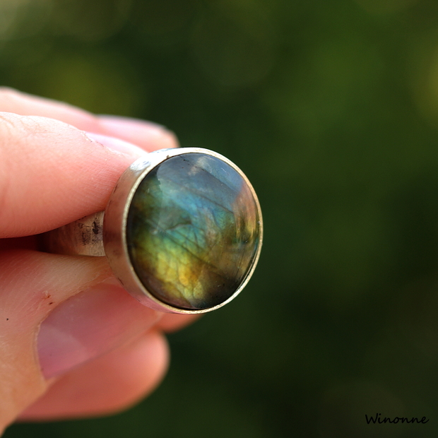 Prsten dělaný tradičními šperkařskými technikami. Do obroučky je vsazen nádherný kabošon labradoritu. Nebylo použito žádného polotovaru.