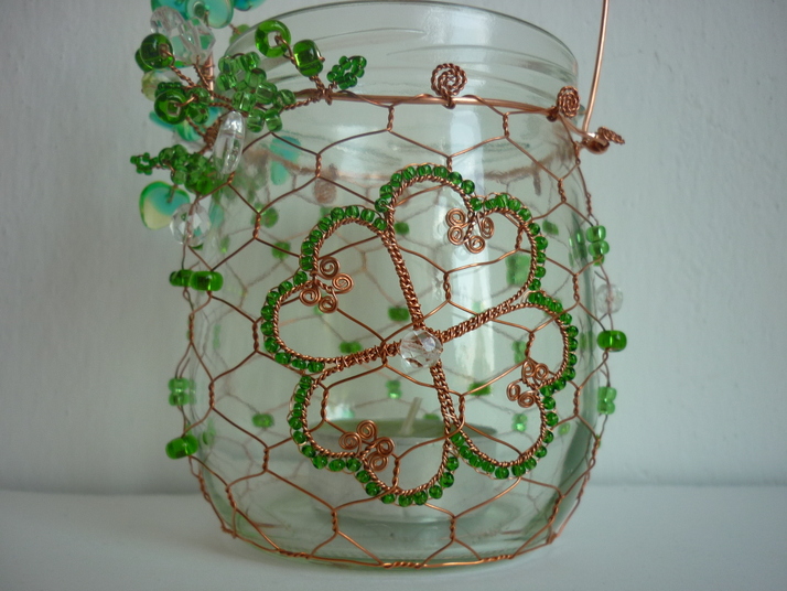 Drátovaná nová sklenice s motivem čtyřlístku je zdobená měděným drátem, zelenými korálky i rokailem a skleněnými broušenými korálky coby kapkami rosy. Už má svého majitele.