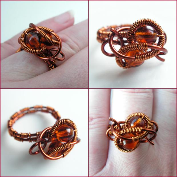 Prsten z lakovaného měděného drátku tl. 1 mm a 0,4 mm doplňují dva skleněné korálky.
