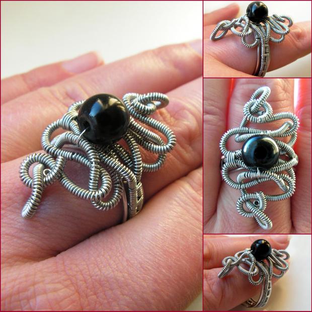 Prsten vyrobený technikou wire-wrapping s nerezového drátku doplněný černou perlou.