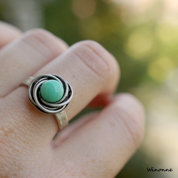 Prstýnek dělaný tradičními zlatnickými technikami v kombinaci s Kroužkováním - Chainmail. Vyroben z alpaky (plechu a kovu) s mentolovým skleněným středem.