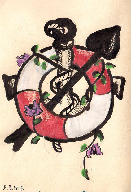 Tuš, akvarelové pastelky. V partě kamarádů při čaji po úžasném víkendu. Parta po dlouhé době pohromadě...